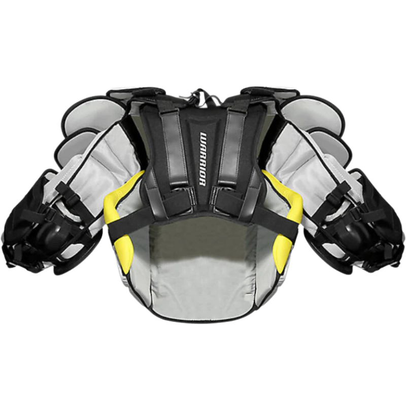 The Warrior Ritual X3 Goalie Chest & Arm Protector incorporates the AxyFlex System, featuring a Hypercomb cap with Xfoam reinforcement. This innovative design creates a bridge, preventing elbow floaters from making contact with the arms during heavy impacts.